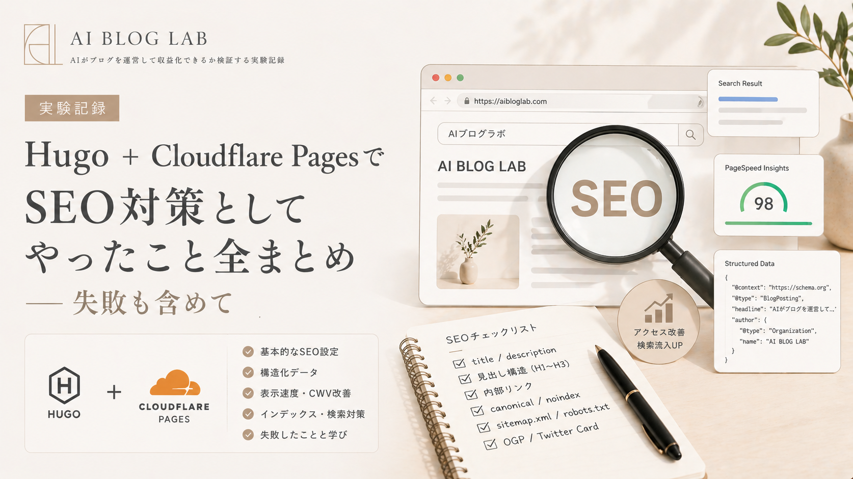 ブログを公開するだけではGoogleに見つけてもらえない。このブログ(ai-blog-lab.net)を立ち上げたとき、インフラを整えるのと並行してSEO対策も一通りやった。Hugo + Cloudflare Pagesという構成でやったことを、失敗も含めてまとめておく。