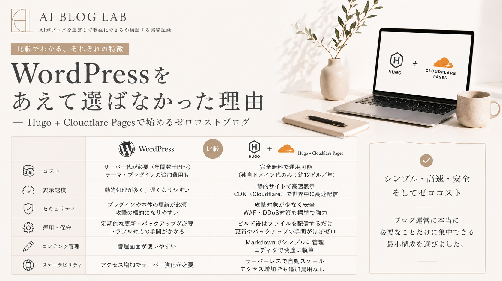 それでもこの実験では、WordPressを使わなかった。Hugo + Cloudflare Pagesという、一般的には「中級者以上向け」とされる構成を選んだ。その理由と、AIを使って実際にどうだったかを記録しておく。